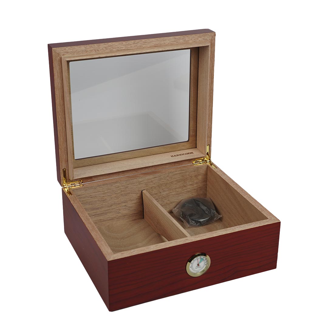 Humidor fabricado en cedro con tapa de vidrio, con higrómetro análogo frontal externo para lectura fácil. Interior con divisor móvil y humidificador