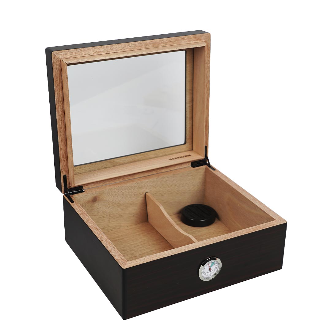 Humidor fabricado en cedro con tapa de vidrio, con higrómetro análogo frontal externo para lectura fácil. Interior con divisor móvil y humidificador